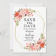 Die elegante Watercolor Coral Floral Save the Date Wedding Announcement Card beinhaltet Rose aus Korallen und botanisches Grün auf einem goldenen geometrischen Rahmen.