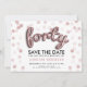 Elegantes "40. Geburtstag Party Save the Date" Design mit Rose Gold Balloon Letters & Glitzer Confetti, und individuelle Name und Details Text. Beeindrucken Sie Ihre Familie und Freunde mit diesem stilvollen und glamourösen Design. Einfach zu bedienen und leicht zu personalisieren. Bestelle noch heute!