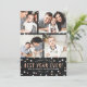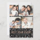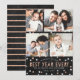 Niedliche Familie New Years Urlaub Fotokarten mit vier Fotos, und weiß und Rose Gold Glitzer sehen Text und Konfetti Punkte. Personalisiert mit Ihren eigenen Fotos und Namen(en). Texturierter schwarzer Hintergrund. [Obwohl einige Elemente dieser Karte so gestaltet wurden, dass sie wie ein Glitzer aus Gold aussehen, wird bei den Einladungen kein Glitzer verwendet - es ist nur ein Druckeffekt.]