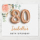 Für eine elegante und weibliche Geburtstagsparty. Ein schick weißer Hintergrund. Dekoriert mit einer Rose Gold und rot rosa Rose Blume, florale, grüne Eukalyptus Blätter, Sprigs, Grün und Imitat Goldsprigs. Personalisieren und einen Namen. Schwarze und goldene Buchstaben. Der Name ist mit einem modernen handgeschriebenen Stilskript geschrieben. Nummer 80 ist mit einem goldenen Schriftart im Ballonstil geschrieben.