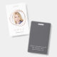 Fügen Sie diesem schicken Abzeichen ein Foto hinzu, um benutzerdefinierte Markennamen-Tags für Ihre Mitarbeiter zu erstellen. Eine goldene Grenze der Imitate Rose umkreist Ihr Foto, darunter Name und Titel. Fügen Sie Ihre Geschäftsadresse oder zusätzliche Informationen auf der Rückseite in Weiß auf elegantem Grau hinzu.