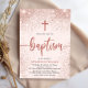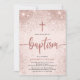 Modernes Foto für Taufe. Das Design beinhaltet Rose Gold Kreuz, Typografie Drehbuch ''Taufe'' und Glitzer Konfetti. Personalisieren Sie mit Party Details auf der Vorderseite und Foto des Babys auf der Rückseite.