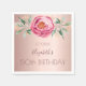 Eine Serviette für eine mädchenhafte und glamouröse 50. Geburtstagsfeier (oder jedes Alter). Ein Imitat Rose gold metallisch aussehend Hintergrund. Große, rosa Rose, grüne Blätter, Blattwerk mit kleinen goldenen Blume. Ein Imitat Glitzer Tropfen, malen Tropfband hinter den Blume. Personalisieren und fügen Sie einen Namen, Alter 50 und ein Datum. Der Name ist in dunklem Rose Gold mit einem modernen handgeschriebenen Stil geschrieben.