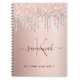 Ein Imitat Rose gold metallische Hintergrund mit eleganten Rose Gold und Rosa und Imitate silberne Glitzer Tropfen, Farbe Tropfen Look. Personalisieren und fügen Sie einen Namen, einen Monogrammbuchstaben und einen Titel hinzu. Der Name ist bordeauxrot geschrieben mit einem großen, modernen, handgeschriebenen Stil-Skript mit Swashes. Ideal für Schule, Arbeit oder als Geheimtagebuch. Um die Swashes behalten, löschen Sie nur den Beispielnamen, verlass die Leerzeichen oder Emoji's vor und nach dem Namen.