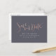 Handgeschriebenes Save the Date Skript in Imitaten Rose Goldfolie auf farbeditierbare rauchgraue, elegante und stilvolle, großartige moderne personalisierte Save the Date Postkarten. Sehen Sie sich alle passenden Stücke in der Sammlung an.