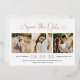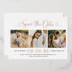 Moderne Rose Goldfolie, Schwarz und Weiß-Hochzeit speichern die Datumskarten mit einer Collage von drei quadratischen Verlobungen Fotos und einem stilvollen Typografie-Design mit chic Kalligraphie-Skript und einem Herz-Akzent. Der einfache und elegante, kundenspezifische Text, der mit dem numerischen Hochzeitstermin, den Braut- und Bräutigam-Namen, der Zeremonie-Position, der Hochzeitswebsite und der formellen Einladung zum Nachfassen von Formulierungen vollständig personalisiert werden kann.