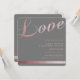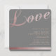 Elegante und stilvolle Einladung zur Kalligraphie mit Rose Gold Drehung. Modernes Layout mit individueller Kalligrafie Imitate Folienskript "Liebe" in Rose Gold mit modernem Schriftart für alle Informationen und Rose Goldgrenze am unteren Rand auf grauem Hintergrund. Karo in unserem Shop für weitere Artikel aus unserer "Rose Gold Kalligraphie" Kollektion.