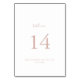 Diese Rose goldene minimalistische Hochzeitsfeier Tischnummer ist perfekt für eine moderne Hochzeit. Das schlichte und elegante Design zeichnet sich durch klassische und extravagante Schrift-Typografie in Rose Gold aus. Das ist eine zweiseitige Tischnummer. Fügen Sie jede benötigte Tischnummer individuell in Ihren Warenkorb.
