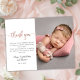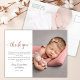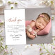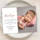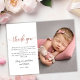 Elegante moderne Rose Gold Script Foto Neugeborenes Baby Vielen Dank Postcard. Mit einem wunderschönen "Dankeschön"-Text in einem kursiven, handgeschriebenen Kalligraphie-Swash-Schwanz-Schriftart-Skript in Imitaten Rose Goldfolie (oder rot-rosa Folie) und vorgefertigte persönliche Nachricht ideal für kleine Mädchen. Einfach mit Ihrem Baby Foto und Details personalisieren.