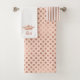 Set aus Rose in Gold und Weiß mit Streifen, auf dem Handtuch und Polka-Punkten, auf dem Waschlappen. Das Handtuch wird in Weiß mit einer goldenen Rose-Krone gemacht, am unteren Rand mit einem benutzerdefinierten korallenfarbenen Text, der Hers. Personalisieren Sie den Text, um zu lesen, was Sie gewollt haben. Eine tolle Geschenkidee für Hochzeiten und neue Zuhause-Besitzer.