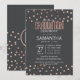 Elegante, schicke und moderne Imitate druckten Rose Goldpolka Punkte und Holzkohle schwarzen Hintergrund, Abschluss Zeremonie Einladungen. Dieses klassische und raffinierte Design eignet sich perfekt für den anspruchsvollen, stilvollen und trendigen Absolventen. Personalisieren Sie Ihre eigene Nachricht auf der Vorderseite und ein individuelles Monogramm auf der Rückseite. Das gesamte Foto-Druckdesign.