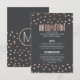 Elegante, schicke und moderne Imitate bedruckten Rose Goldpolka Punkte und Holzkohle schwarzen Hintergrund, Wedding Information Details Karte. Dieses klassische und raffinierte Design eignet sich perfekt für den anspruchsvollen, stilvollen und trendigen Absolventen. Personalisieren Sie Ihre eigene Nachricht auf der Vorderseite und ein individuelles Monogramm auf der Rückseite. Das gesamte Foto-Druckdesign.