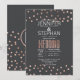 Elegante, schicke und moderne Imitate druckten Rose Goldpolka Punkte und Holzkohle schwarzen Hintergrund, Hochzeitseinladungen. Dieses klassische und raffinierte Design ist perfekt für das trendige und stilvolle Ehepaar. Personalisieren Sie Ihre eigene Nachricht auf der Vorderseite sowie ein individuelles Monogramm auf der Rückseite. Das gesamte Foto-Druckdesign.