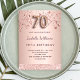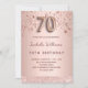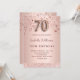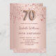 Eine moderne, stilvolle und glamouröse Einladung zu einer 70. Geburtstagsfeier. Eine Rose goldener Hintergrund mit Rose Gold und rosa tropfenden Sternen. Der Name ist mit einer modernen dunklen Rose goldfarbenen handgeschriebenen Stil geschrieben. Personalisieren Sie Ihre Party-Daten und fügen Sie sie hinzu. Nummer 70 wird mit einem Schriftart im Ballonstil geschrieben, Skript.