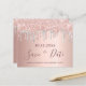 Eine trendige und mädchenhafte Save the Date-Karte für eine 50. Geburtstagsfeier (oder jedes Alter). Ein feminin rosa, Rose Gold Imitate metallisch aussehend mit Rose Gold und Imitate silberne Glitzer Tropfen. Personalisieren und fügen Sie ein Datum und Name/Alter 50. Dunkle Rose goldfarbene Buchstaben. Der Text: Save the Date ist mit einem großen angesagten, handgeschriebenen Stilskript geschrieben.