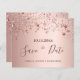 Eine junge und trendige Save the Date für eine Quinceañera, 15. Geburtstagsfeier. Ein feminin rosa, Rose vergoldetes Imitat metallisch aussehend mit Sternen dekoriert. Personalisieren und fügen Sie Datum und Name/Alter hinzu. Der Text: Save the Date ist mit einem großen angesagten, handgeschriebenen Stilskript geschrieben.
