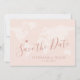 Rose Gold Rosa und Kupfer Farbe Welt Karte Save the Date Karte für eine Hochzeit in Urlaubsort mit einem beweglichen Herz-Lage Marker und Ihre Verlobung Foto neben niedlichen und eleganten modernen Typografie, die hübsch und minimalistisch ist. Ideal für tropische, Strand-, Insel-, Stadt-, Berg- und Abenteuerorte in der Hochzeit in Urlaubsort. Klicken Sie auf KURZIEREN, um das Herz zu bewegen, den Hintergrund und die Textfarbe zu ändern, Schriftart zu ändern. Karo in unserem Designer-Shop für die Koordination von Artikeln!