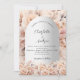 Eine moderne, stilvolle und romantische Einladung für eine Hochzeit. Ein silber aussehender Bogenrahmen aus Imitaten, der mit sanften, in Rose goldfarbenen Blume geschmückt ist. Personalisieren und fügen Sie Ihre Namen und die Details.