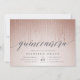 Eine wunderschöne Rose Gold Quinceañera Einladungen mit einem rot rosa ombre Hintergrund mit vertikalen Fäden von glänzenden Imitaten Rose goldfarbene Folie Lichter. "Quinceañera" erscheint unter dem Bild einer schicken Kalligraphie-Schriftzeichen-Typografie. Personalisieren Sie sich mit Ihren Quinceanera Party Details in elegantem Grau.