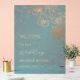 This elegant transparent wedding welcome sign features rose gold line art flowers on a transparent teal background.
