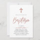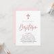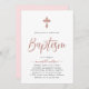 Moderne Girl-Taufe Einladung mit rosafarbenem Hintergrund auf der Rückseite , Goldkreuz in der Rose und Typografie-Drehbuch ''Taufe'' in Rose, handgeschriebenes, vergoldetes Blatt auf der Vorderseite. Personalisieren Sie Ihre Feierlichkeiten mit modernen Schriften weiter.