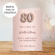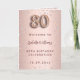 Ein Imitat Rose Gold Farbverlauf Hintergrund mit rosa Diamanten. Der Name ist mit einer modernen dunklen Rose goldfarbenen Handschrift geschrieben, die als Stilschrift dient. Nummer 80 wird mit einem Schriftart im Ballonstil geschrieben, Skript. Willkommenstext, Foto, Menü und ein Dankeschön auf der Rückseite. Möglicherweise müssen Sie den Menütext und den Namen auf der Rückseite anpassen, abhängig davon, wie viel Text Sie benötigen. Sie können auch das Foto auf der Innenseite entfernen und ein Programm hinzufügen, wenn Sie möchten.