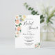 Eine trendige Blumendusche in Weiß, Korallen und Pfirsich. Ein schick weißer Hintergrund auf der Vorderseite. Weiße, korallenfarbene und pfirsichfarbene Blume, Blumengestühle. Moderne, große handhabbare Schrift, Typografie mit dem Text: Brautparty. Vorlagen für den Namen der Braut und Party Details. Dunkelgrauer Text. Zurück: korallenfarbener Hintergrund.