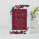 Eine moderne, schicke und elegante Rose Goldtypografie Blumenrot Weihnachtsfeiereinladung mit handgemalten roten bordeauxfarbenen Wasserfarbenblättern auf einem eisblauen mit weißem Schnee und Schneeflocken.