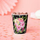 Schwarz ist die perfekte Kulisse für diese feminine Rose, die in Rosa-, Pfirsich- und Cremetönen geblümt ist. Diese femininen Papiertassen wären eine schöne Ergänzung für ein Brautparty, ein Gartenfest, eine Geburtstagsfeier oder eine Hochzeit im Freien.