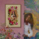 Die St. Rose Lima ist umgeben von einem Arrangement aus wunderschönen, farbenfrohen Blume und verzierten Scrollarbeiten. Ein Hintergrund der gelben Brokade ergänzt die aufwändige Illustrationssammlung.
