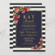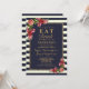 Elegante, schicke und ländliche Rosen und Rosa Rosen mit Marineblau und Elfenbeinweiße Streifen und Imitate bedruckt Gold umrissen, Einladungen der Verlobungsparty. Dieses klassische und raffinierte Design eignet sich perfekt für ein stilvolles, trendiges und stilvolles Ehepaar. Personalisieren Sie mit Ihrer eigenen Nachricht auf der Vorderseite und einem angepassten Monogramm auf der Rückseite. Das gesamte Foto-Druckdesign.