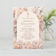 Eine moderne, stilvolle und mädchenhafte Einladung für eine Erste Kommunion. Creme, pfirsichfarbener Hintergrund, Bogenrahmen, mit cremefarbenen Blume verziert. Personalisieren und fügen Sie Ihren Namen und die Details.