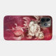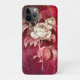 A delicate monochrome bouquet of roses is set against a vibrant red background, creating a striking contrast. The composition is accented with speckled textures, adding depth to the floral imagery.