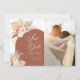 Eine elegante fallterracotta bohemian terracotta Thema Hochzeit speichern das Datum kalligraphische Schrift mit handgezeichnet Aquarell gedämpfte Rosa, lila-weiß getrocknete Rose, Pampas Gras und Palmenblatt mit einem Seitenbogen Hintergrund. Ersetzen Sie das Foto durch Ihr eigenes.