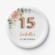 Für eine elegante und weibliche Quinceañera, 15. Geburtstagsfeier. Ein schick weißer Hintergrund. Dekoriert mit einer Rose Gold und rot rosa Rose Blume, florale, grüne Eukalyptus Blätter, Sprigs, Grün und Imitat Goldsprigs. Personalisieren und einen Namen. Schwarze und goldene Buchstaben. Der Name ist mit einem modernen handgeschriebenen Stilskript geschrieben. Nummer 15 wird mit einem goldenen Schriftart im Ballonstil geschrieben.