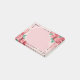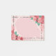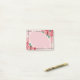 Ein rosa Post-it-Design mit rosa und rote Rose Illustrationen an den gegenüberliegenden diagonalen Kanten und schwarzen linearen Rändern.
