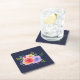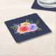 Untersetzer aus Papier mit einem hübschen Blumenstrauß von Aquarellfarben-Rose mit Zierteilen, Blätter und Ästen, die alle in einer farbenfrohen Blumengestalt zusammengesetzt sind. Navy Hintergrund.
