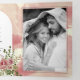Rose rosa Aquarellkaktus Blume und Blätter Boho blumenreiche dreifach geflieste Hochzeit Einladung. Dieses elegante Design zeigt einen Bogen-Rahmen und staubige Rose rosa Aquarellkaktus Blume mit Sukkulent an den oberen und unteren rechten Ecken und Ihren Text in staubiger Rose und schwarz auf dem Cover. Die Innenfläche der ersten und letzten Paneele sowie die Außentafel beinhalten Fotos des Ehepaares, während die Innenseite des mittleren Panels Ihre Hochzeitsdetails zeigt. Die Rückseite zeigt Details über UAWG und mehr.