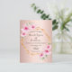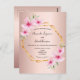 Eine elegante tropische Sommerhochzeit. Mit einem geometrischen Rahmen in goldenem Imitat, der mit hellrosa Hibiskus dekoriert ist, Blume tropische Blumen mit etwas Grün. Eine Rose Gold Imitat metallische Hintergrund. Die Namen der Braut und des Bräutigams werden mit einem modernen Handgeflecht geschrieben. Schwarzer Text. Zurück: Imitate Rose goldfarbenen Hintergrund. Tipp: Wenn Sie es nicht so gewollt haben, dass es wie eine Postkarte aussieht, klicken Sie auf Anpassen, gehen Sie auf die Rückseite und entfernen Sie den Trenner und posten Sie die Briefmarke.