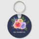 Personalisierter Schlüsselanhänger mit einem hübschen Bouquet von Aquarellfarben-Rose mit Sprigs, Blätter und Ästen, die alle in einer farbenfrohen Blumengestalt verwoben sind. Navy Hintergrund.