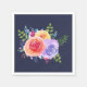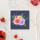 Papierservietten mit einem hübschen Bouquet von Aquarellfarben-Rose mit Sprigs, Blätter und Ästen, die alle in einer farbenfrohen Blumenstruktur zusammengesetzt sind. Navy Hintergrund.