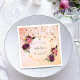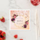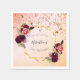 Eine Papierserviette für eine mädchenhafte, weibliche und glamouröse Geburtstagsparty des 21. (oder eines beliebigen Alters). Ein eleganter goldfarbener und rot-rosa Farbverlauf mit einem geometrischen Rahmen in goldenen Imitaten. Die Einrichtung besteht aus dunklen, lila und bordeauxfarbenen Blume, Rose und Boho-Federn. Rose Gold tropfende Sterne. Personalisieren und fügen Sie einen Namen, Datum und Alter 21. Der Name wird mit einem handgeschriebenen Stift geschrieben, schwarze Buchstaben. Datum und Alter als gebogener Text.