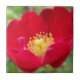 Makroaufnahme einer hellroten Single-Blütenblattminiatur-Rose mit sonniger gelber Mitte.