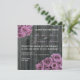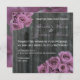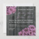 Eine Hochzeitseinladung mit einem Foto aus verwittertem Stallholz. Antike inspirierte Fotos aus rosa / violett rosa Bouquets oben links und unten rechts Ecken. Personalisieren Sie den passenden Text mit den Details Ihrer Veranstaltung. Auf der Rückseite befinden sich die Blätter der Rose, die über den Holzboden verstreut sind. Die Aufnahme stammt von Braut und Bräutigam zusammen mit ihren Eltern.