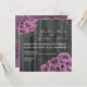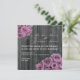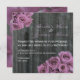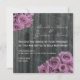 Eine Hochzeitseinladung mit einem Foto aus verwittertem Stallholz. Antike inspirierte Fotos aus rosa / violett rosa Bouquets oben links und unten rechts Ecken. Personalisieren Sie den passenden Text mit den Details Ihrer Veranstaltung. Auf der Rückseite befinden sich die Blätter der Rose, die über den Holzboden verstreut sind.