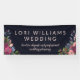 Willkommen Banner für ein Unternehmen in dunkelmarineblau mit trendigen Schriftart und böhmischen Bouquets in Rosa, Blau, Grün und Bordeaux.