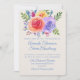 Eine Hochzeitseinladung mit einem fantasievollen Blumenstrauß mit Aquarellfarben-Rose. Stilvoll, skurril und kreativ. Ein Bündel von Rose in Rosa, lila und Gelb. Mit viel Grün und Blätter in Grün, Rosa, lila und Blau. Hintergrund ist eine cremefarbene Champagnerfarbe.