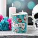 Eine farbenfrohe Tasse für den Tag der Toten, mit einer Vielfalt dekorativer Zuckerschädel mit Blume und wirlfarbenen Akzenten auf türkisblauem Hintergrund. Die angegebene Banner- und Textschicht "Feliz Dia de los Muertos" kann gelöscht werden, um dieses Design für andere Gelegenheiten oder den Alltag zu nutzen. Suchen Sie ID725 um andere Farbauswahl und Produkte mit diesem lustigen Muster zu sehen.