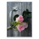 Eine Dankeschön-Karte mit einem Foto aus einem kleinen Strauß mit drei hellrosa Rose und Grünpflanzen, umhüllt von Burlwein, der sich im Griff einer Scheunentür ruht. Der weiße Text auf der Vorderseite sagt "Danke." Im Inneren ist leer. Diese Karte kann auch in kleinerer Notecardgröße erworben werden. Suchen Sie nach passenden Hochzeitseinladungen und mehr in Jill's Paperie.