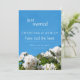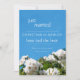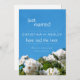 Schöne Blumenankündigung "gerade verheiratet" mit traumhaften weißen Rosen und einem klaren blauen Sommerhimmel.